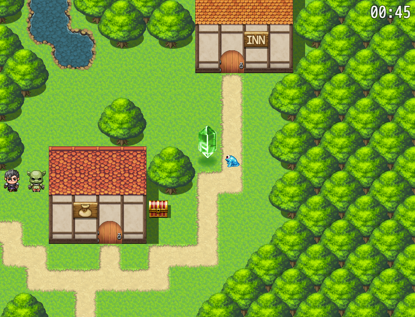 The Control Timer command must be used twice to start a new timer, first to Set Time to a fixed time or based on a variable, and then a second time to Start the countdown. In the Start operation, the timer can be shown using the "Show Timer" option, and can be made to continue counting with the "Continue in Battles" option. It can be shut down using the Stop operation. Unlike RPG Maker 2000, two timers can be set at once.