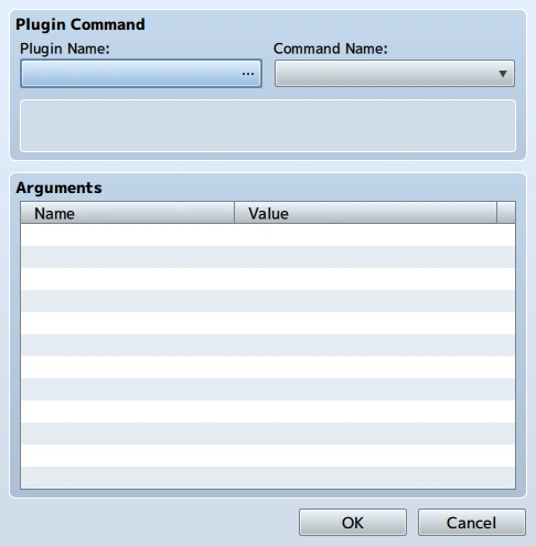 Plugin makers can now define plugin commands to appear in the Plugin Command window. The user can now select a plugin from a drop down list, then a command from the Command Name dropdown list. A label describing how the command works appears below, and a list of Arguments appears as a name and value table, which the user can manually edit.